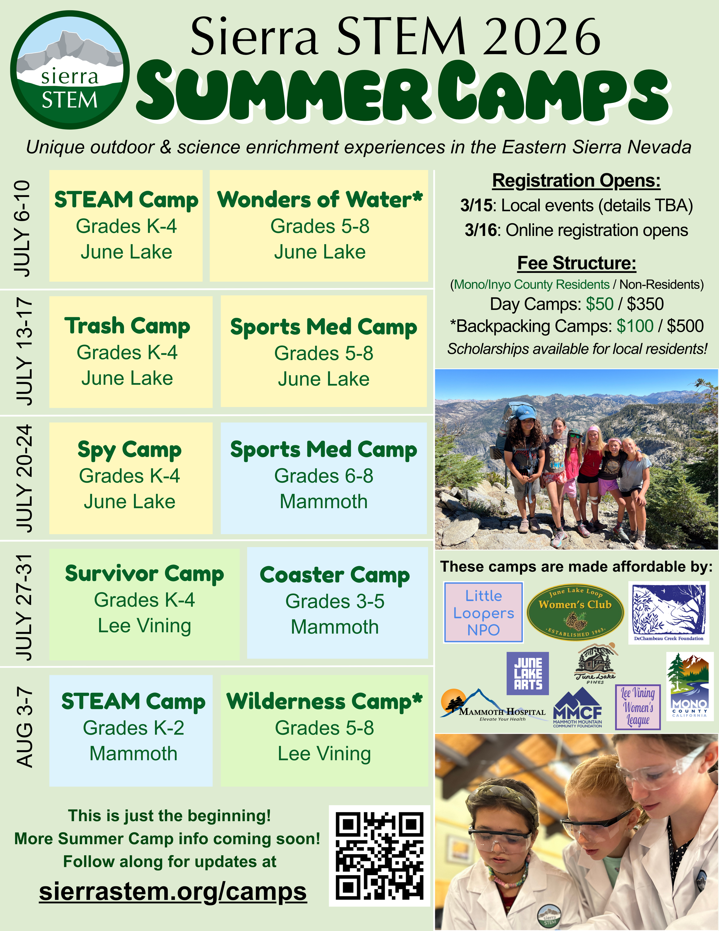 Scholarships are available for Mono/Inyo County residents who would otherwise not be able to enroll. Simply select “scholarship” when registering for camp through our online store, or email info@sierrastem.org to sign up using a scholarship. Scholarships open on March 15 during in-person registration and on March 16 online.